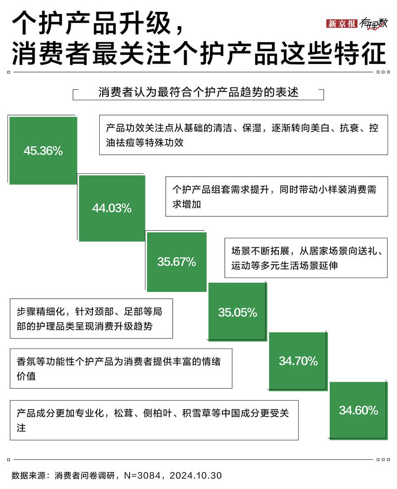 In terms of personal care, young people also show a positive consumption attitude. 45.36% of consumers’ concerns about the efficacy of personal care products have changed significantly. In the past, the cleaning and moisturizing functions of personal care products may be able to meet their basic needs, but now, they are gradually pursuing special effects such as whitening, anti-aging, oil control and acne removal.